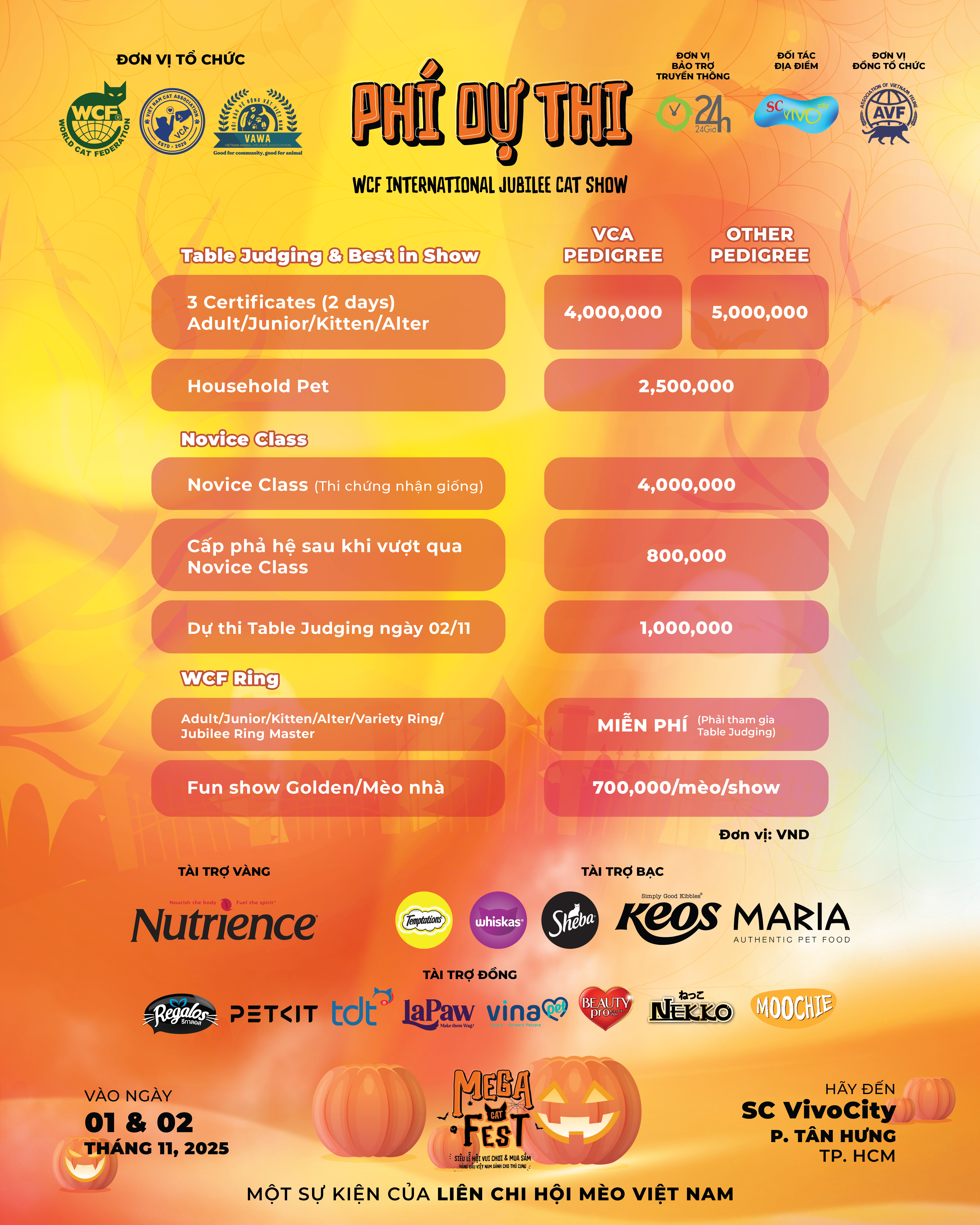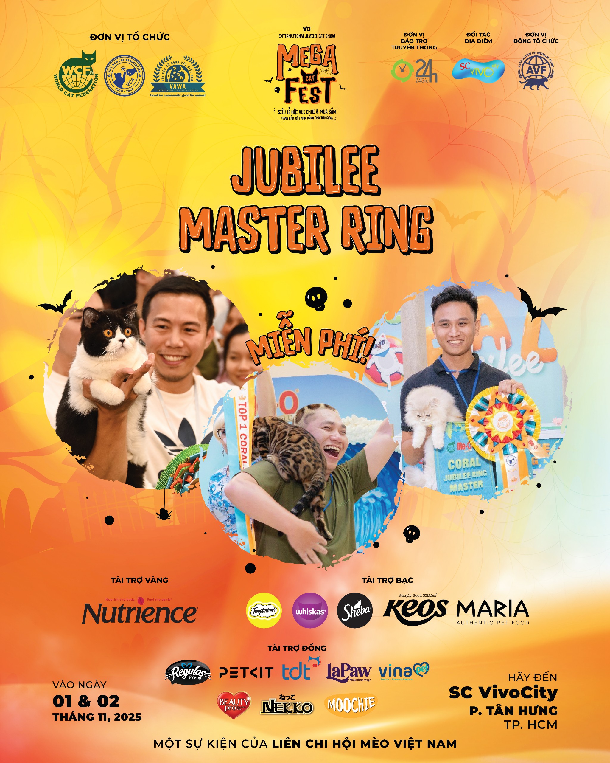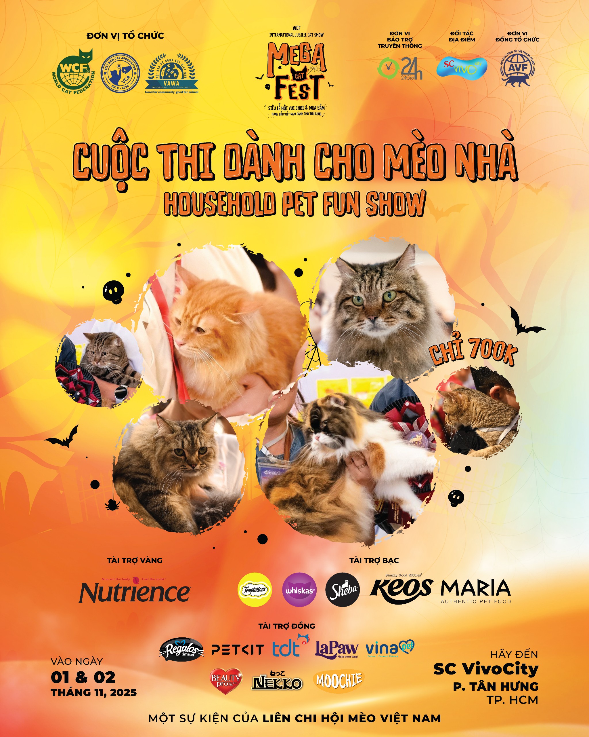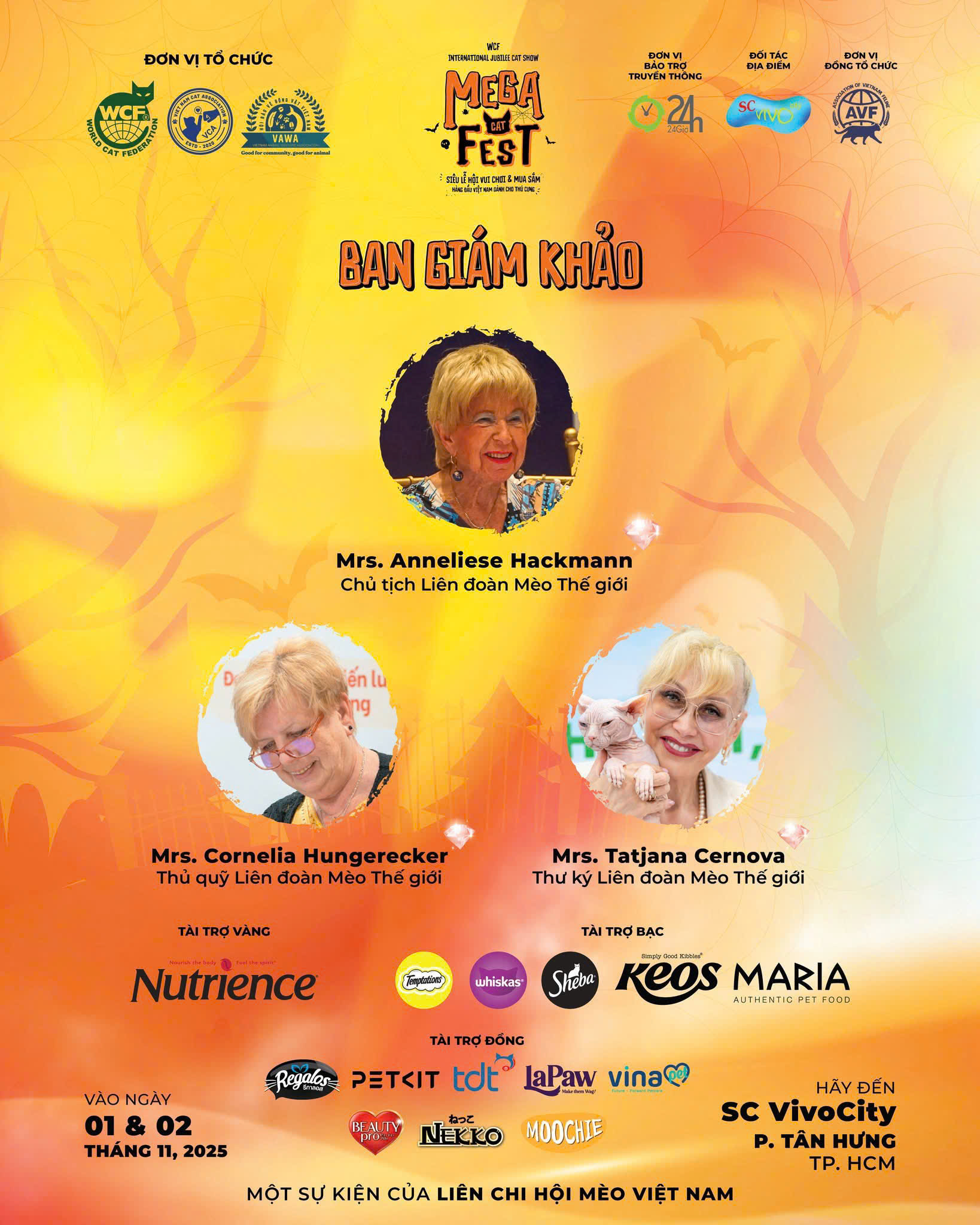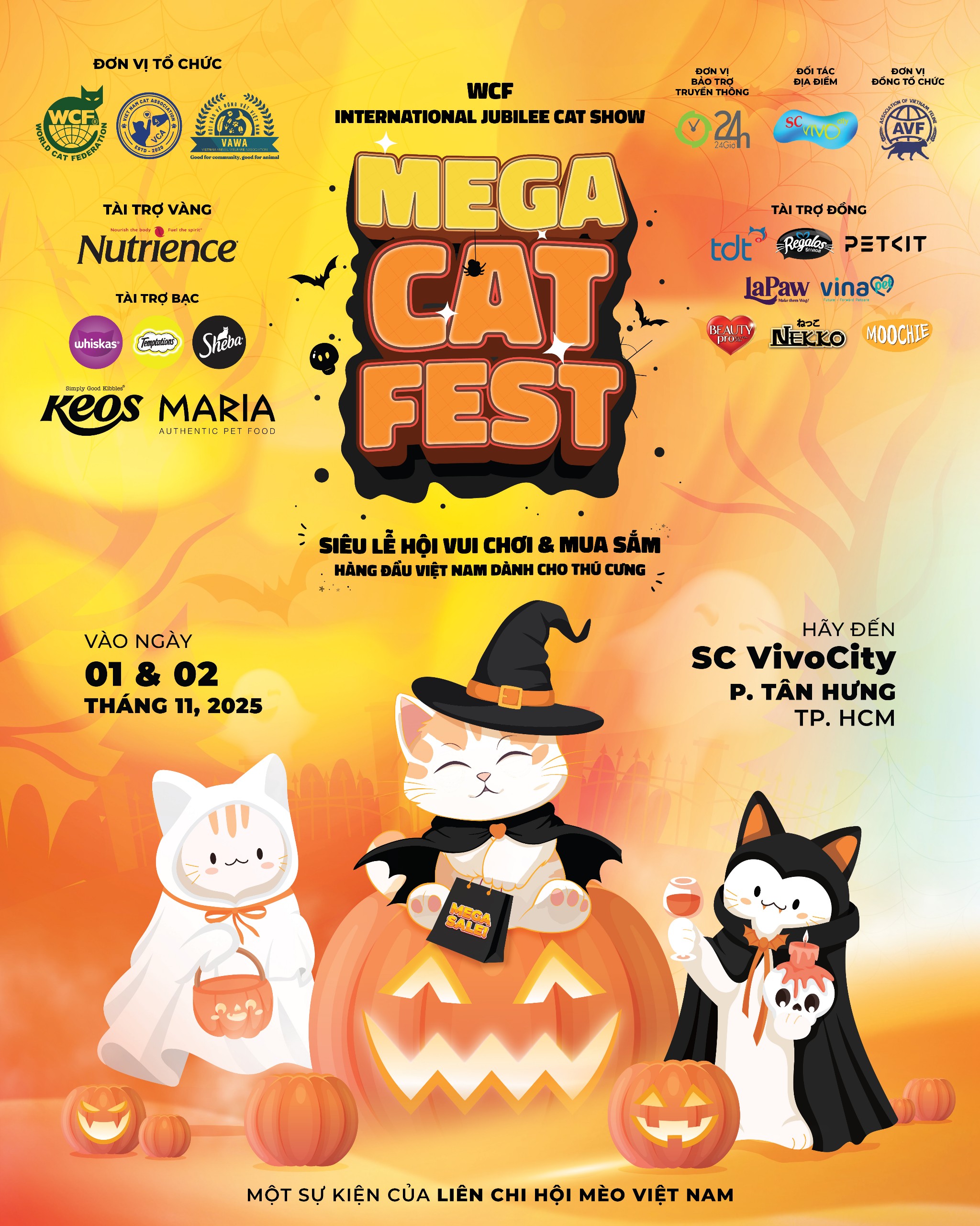 TP.HCM – Ngày 1–2/11/2025, Liên Chi hội Mèo Việt Nam (VCA) dưới sự bảo trợ của World Cat Federation (WCF) và Hội Bảo Vệ Động Vật Việt Nam (VAWA) tổ chức Mega Cat Fest – WCF International Jubilee Cat Show 2025 tại SC VivoCity, phường Tân Hưng, thành phố Hồ Chí MInh. Sự kiện hứa hẹn trở thành điểm hẹn lớn nhất năm của cộng đồng yêu mèo với chuỗi hoạt động giải trí – thi đấu – trải nghiệm – kết nối cộng đồng diễn ra xuyên suốt hai ngày 1 & 2 tháng 11 năm 2025.