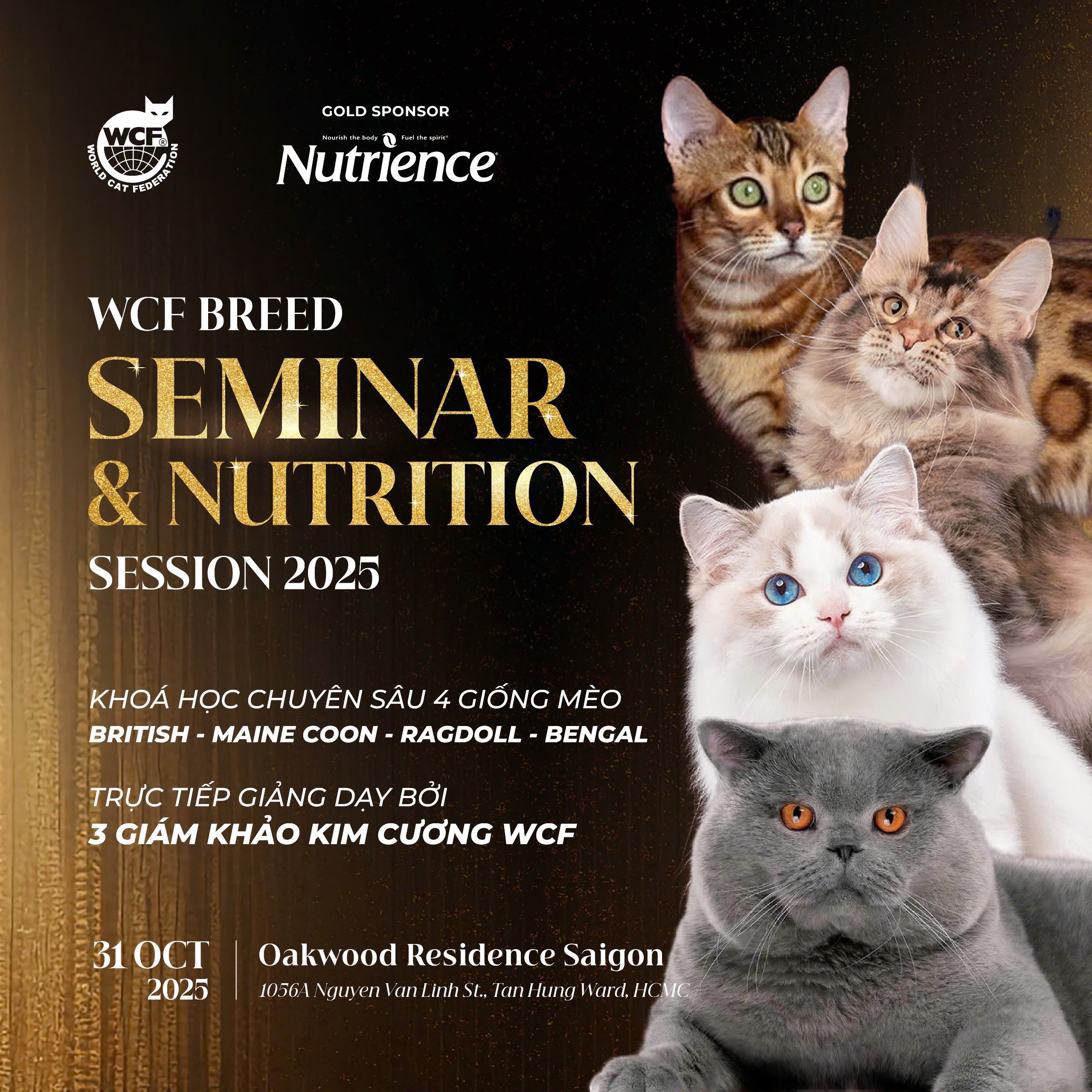 Trước thềm lễ hội (31/10), khóa WCF Breed Seminar & Nutrition quy tụ ba Giám khảo Kim cương WCF đào tạo chuyên sâu bốn giống British, Maine Coon, Ragdoll, Bengal. Nội dung hướng đến breeder, pet shop, groomer và người nuôi muốn cập nhật kiến thức quốc tế về tiêu chuẩn giống, dinh dưỡng và grooming sao cho đúng.